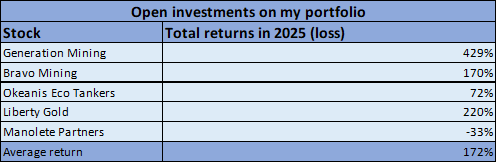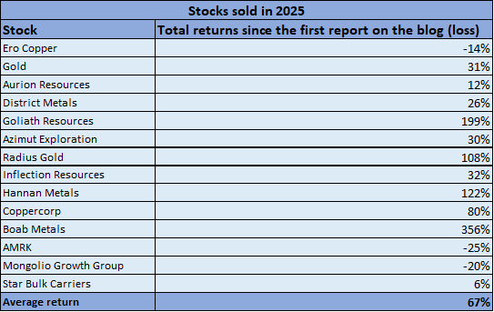 2025 returns were mainly driven by higher platinum, palladium, gold and silver prices. You can find reports on all these metals on my blog. The only regret I have is not having invested more on these sectors.