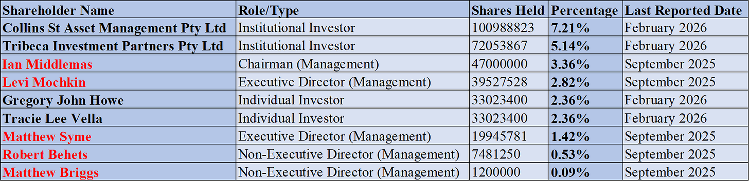 Management owns 8.22% of the stock. Collins St is the largest shareholder which is great since they are one of the most sophisticated resource investors in Australia.