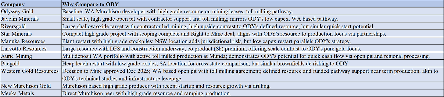 In summary, Odyssey Gold stands out as the cheapest near-term gold producer on the ASX, trading at a massive discount to its NPV (A$404M vs. A$49M market cap) with a funded, low-capex path to 2026-2027 production via toll mining.