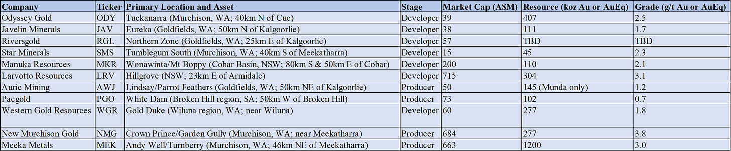 New Murchison Gold and Meeka are already in production. This offers lower torque to gold prices. They already trade at much higher EV/oz valuations: A$2,400/oz and A$500/oz, respectively. Whereas ODY sits at only A$86/oz with a defined 407koz high grade resource still in the developer stage.