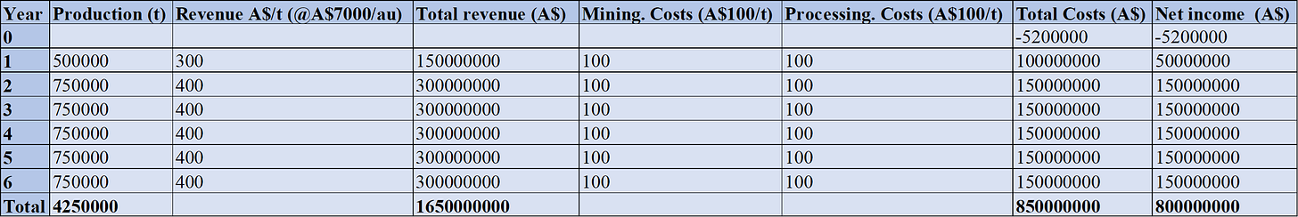 The table above is mostly in tons, which may be confusing for most mining investors as troy ounces are the most common measurement in precious metals. The reason I used tons is because the costs of the toll mining agreement are measured in A$/t. Bear in mind the table is measured using 100% attributable figures, while ODY owns 80% of the project.