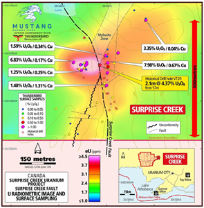 The helicopter-supported program will test priority targets identified along the Surprise Creek Fault Zone, an area hosting high-grade uranium surface samples and historic drill intercepts1,2. Mustang has engaged Base Diamond Drilling Ltd. to complete up to 2,000 metres of drilling focused on following up historical intercepts, improving structural understanding of the mineralized zones, and testing undrilled targets generated by recent geophysical surveys.