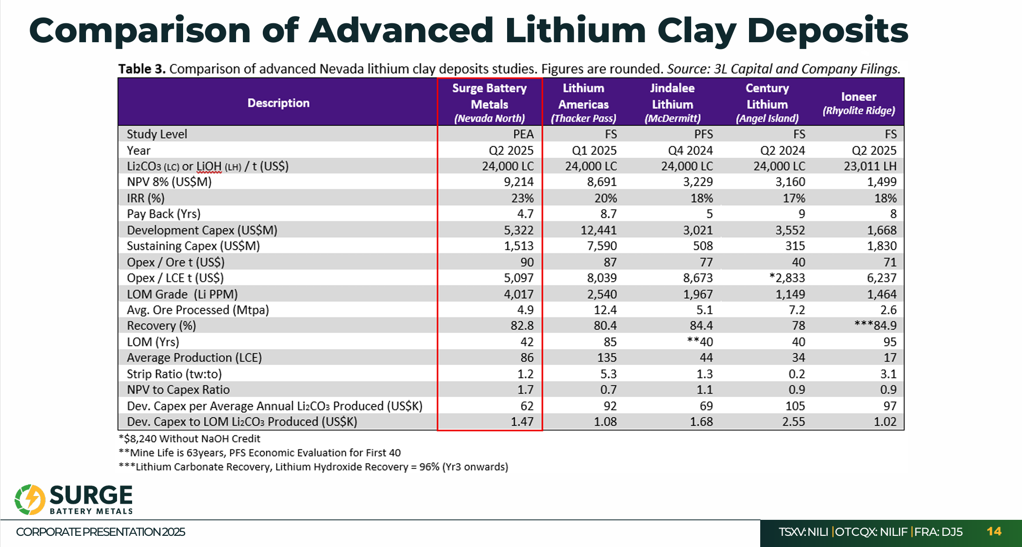 Both projects operate under Nevada’s mining-friendly regulatory environment and within driving distance of Tesla's Nevada GIGA factory. Both target claystone deposits. But they couldn’t be more different in execution, and the investment upside, in my opinion, leans heavily toward Surge Battery Metals (TSXV: $NILI / OTC: $NILIF ).