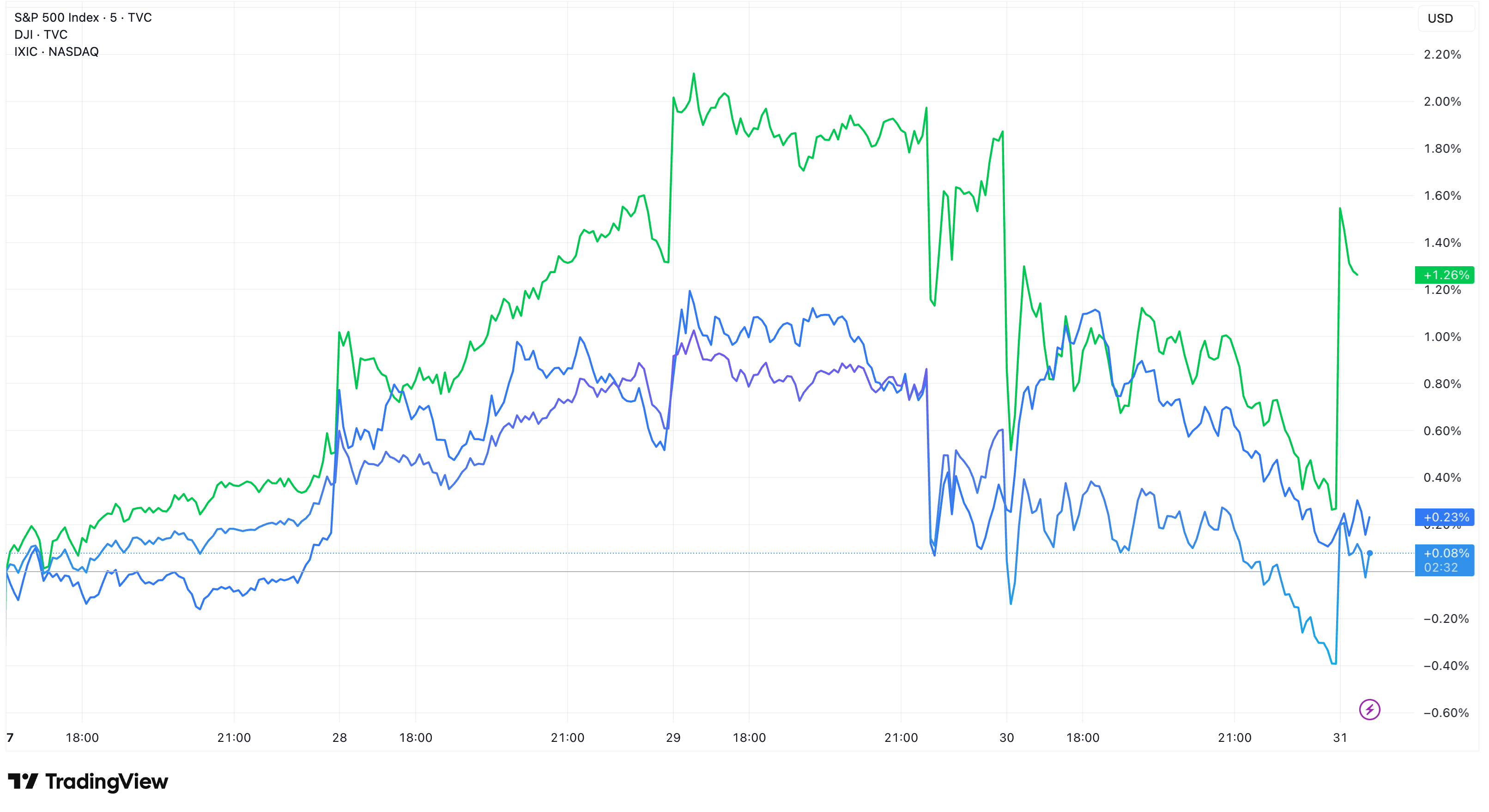 Broader markets reflected the upbeat mood: the S&P 500 gained 0.7%, the Nasdaq Composite rose 1.5%, and the Dow Jones added 83 points, or 0.2%, capping a winning week and month for U.S. equities.