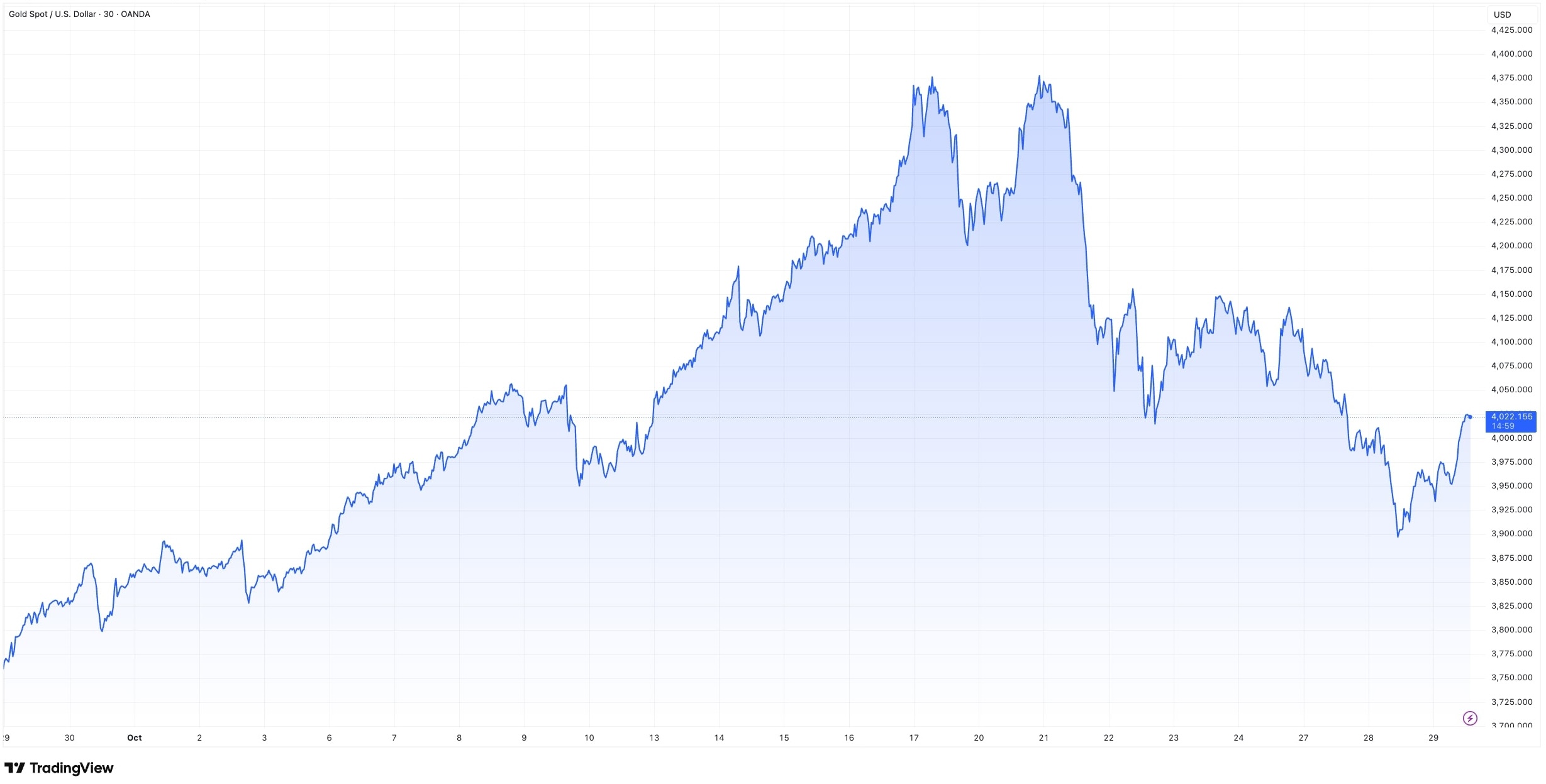Gold prices have pulled back sharply following a torrid rally that pushed them to a record above $4,380 an ounce last week. Technical indicators suggested the surge had gone too far, too fast, coinciding with reduced demand for safe havens amid signs of progress in US-China trade relations. Even Bitcoin hasn’t matched gold’s recent volatility.